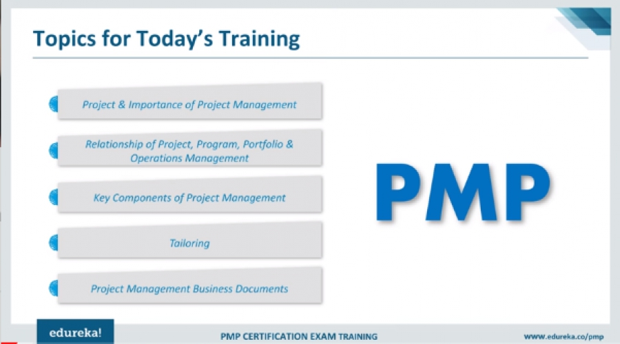 This Edureka video on PMP Training will give you a complete insight of PMP Certification along with various integral topics of PMP and its exam preparation process. This video helps you to learn following topics: 1. Project & Importance of Project Management 2. Relationship of Project, Program, Portfolio & Operations Management 3. Key Components of Project Management 4. Tailoring 5. Project Management Business Documents